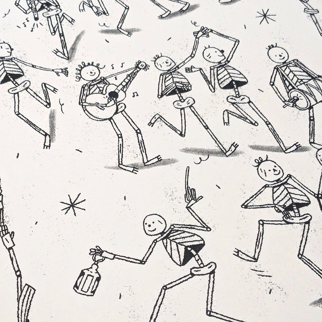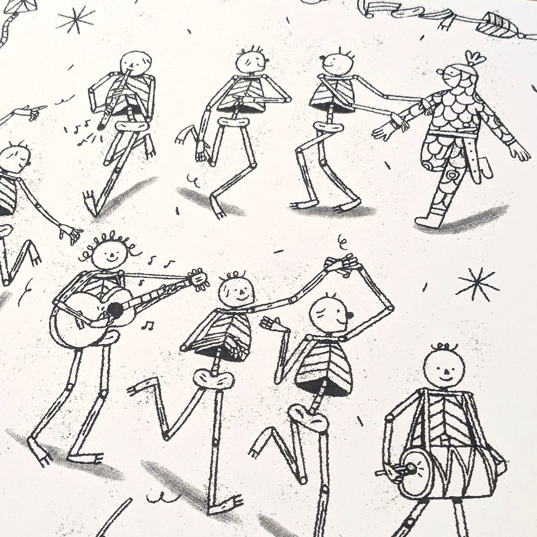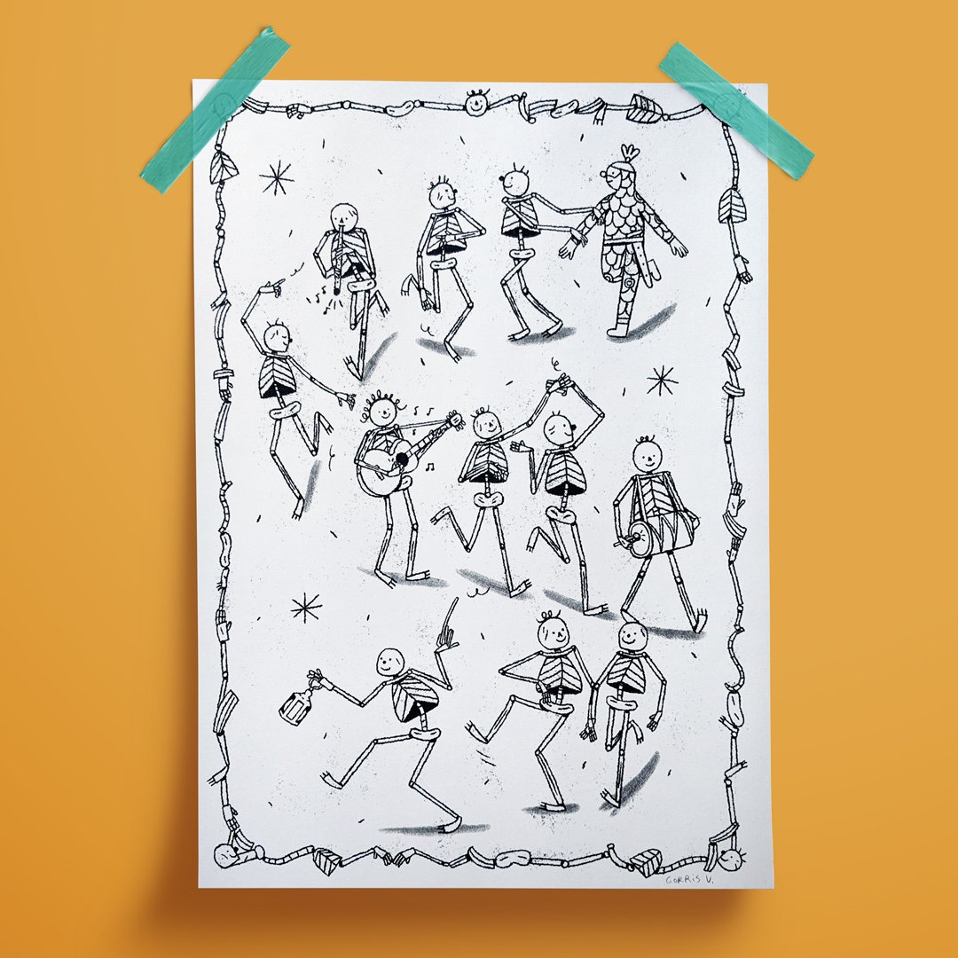 Cette illustration s’inspire des danses macabres, un motif artistique et théâtral de la fin du Moyen Âge représentant la Mort entraînant les vivants dans une ronde funèbre.
